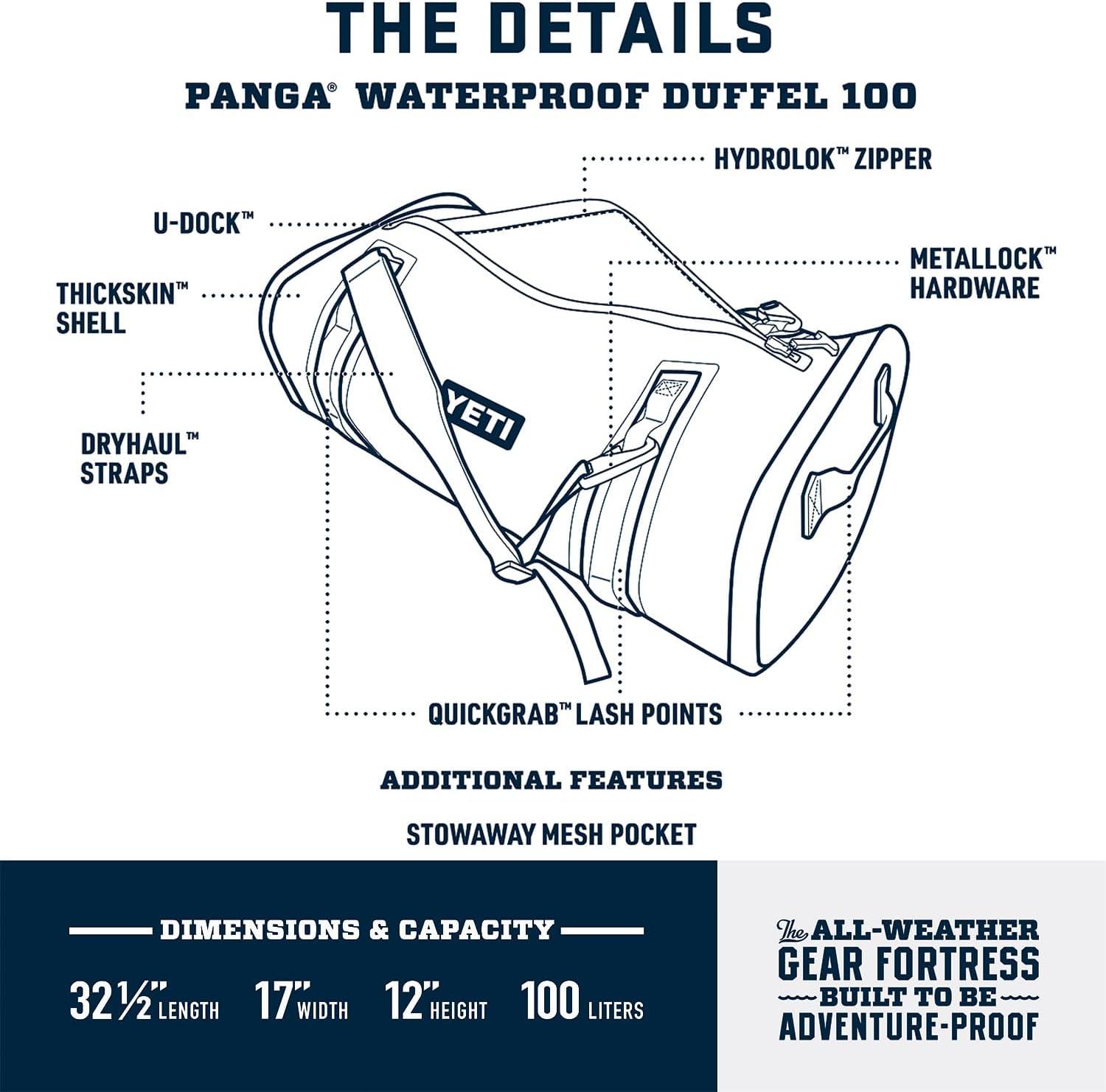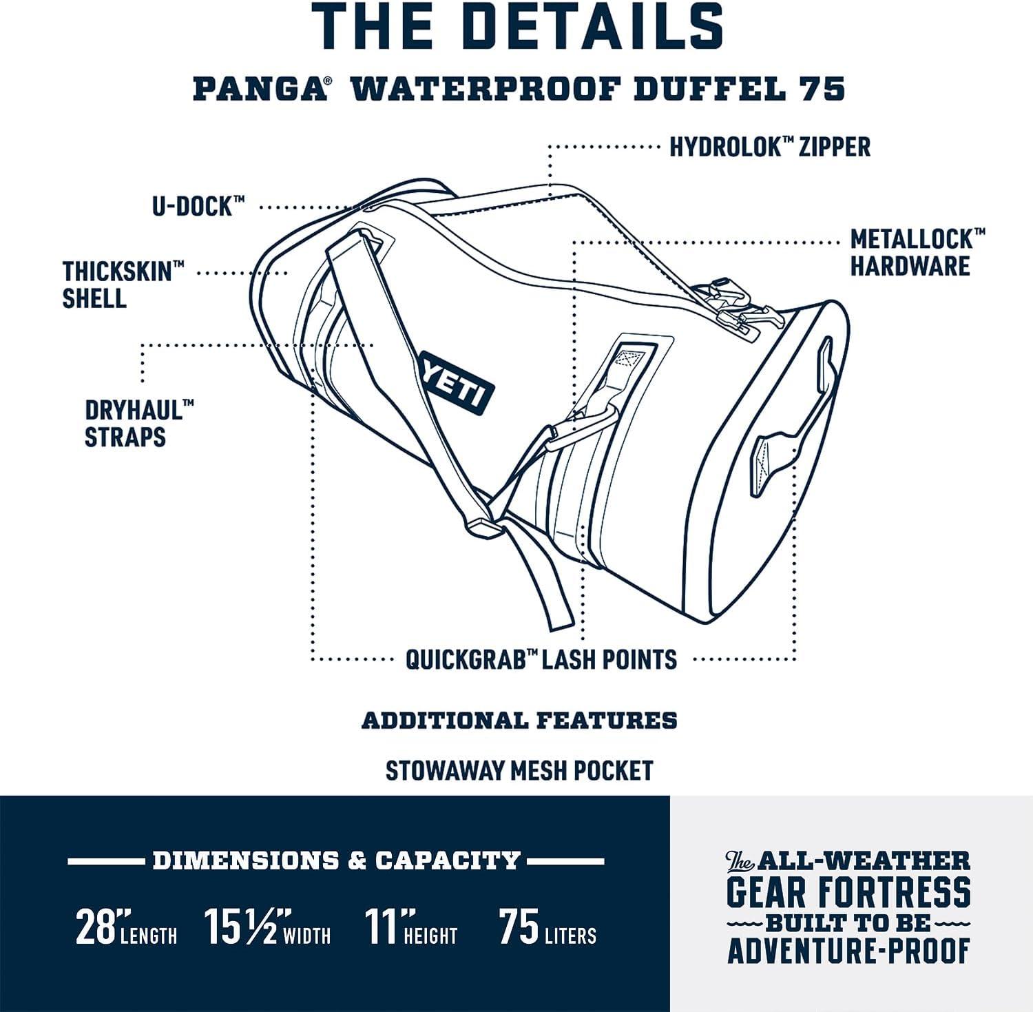 Your waterproof gear sanctuary. Our Panga Waterproof Duffel equips you with an ultra-tough, waterproof fortress designed for off-grid adventures. The HydroLok Zipper provides no entry points for moisture and can handle submersion, keeping all contents bone-dry. Note: This is not a cooler.