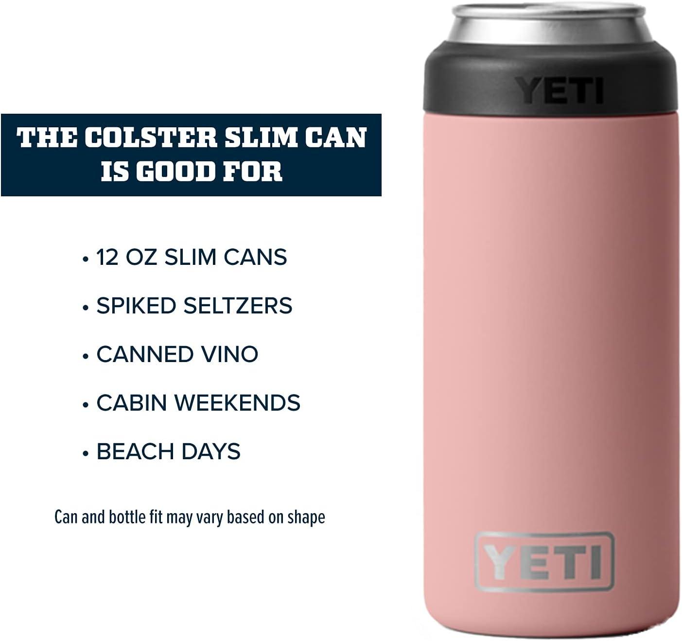 The YETI Slim Colster is good for: 12 oz Slim Cans, Spiked Seltzers, Canned Vino, Cabin Weekends and Beach Days. Can and bottle fit may vary based on shape
