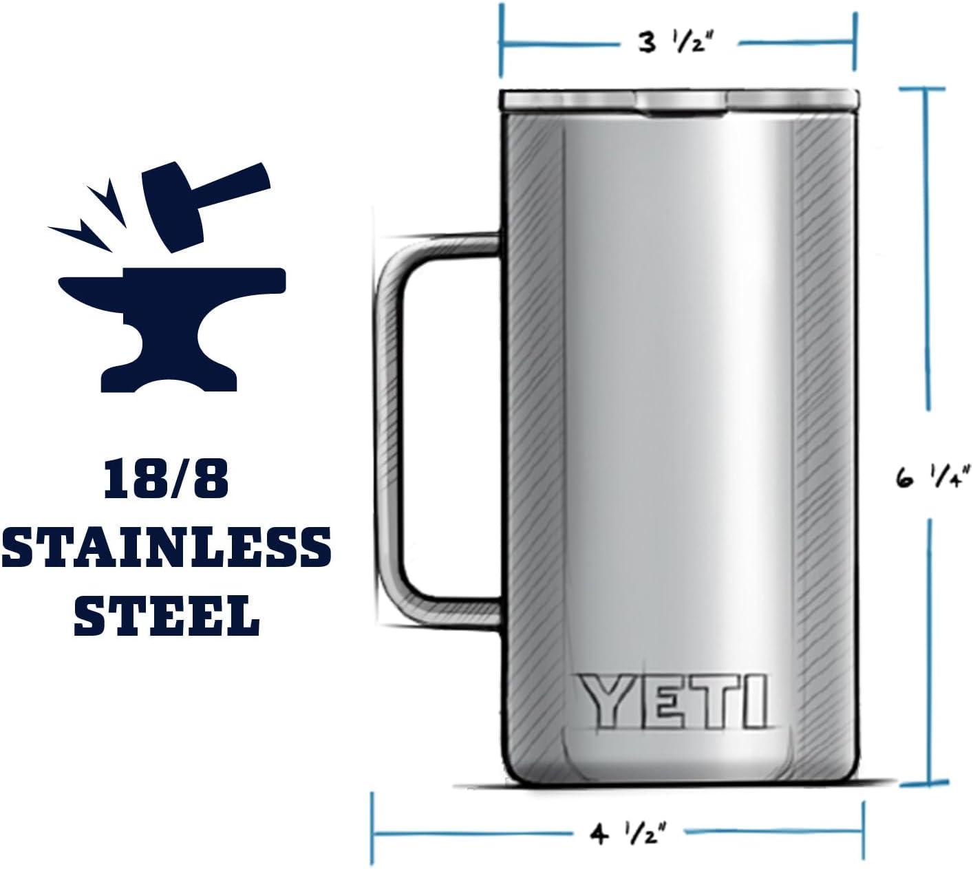 The YETI 24 oz. Rambler Mug stands 6.4 in high and has a lip diameter of 4.6 in, and with the handle its 5 inches wide