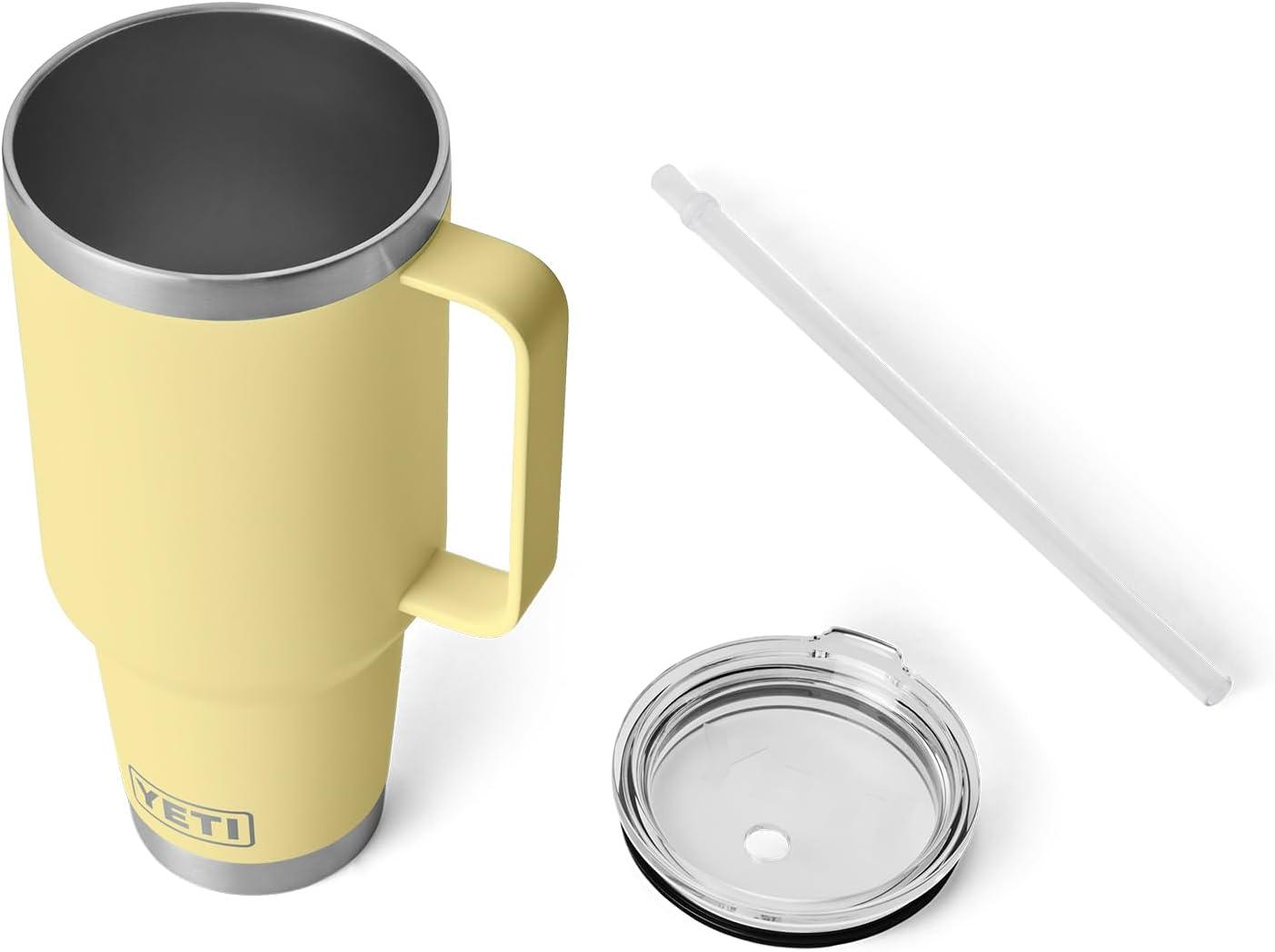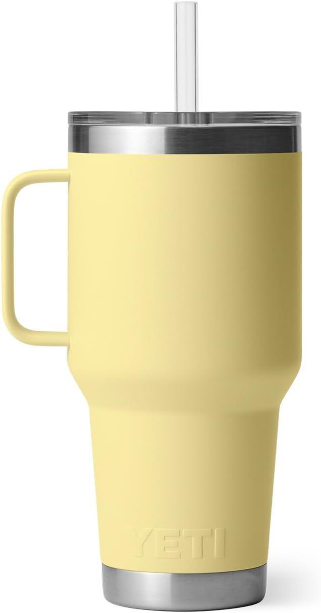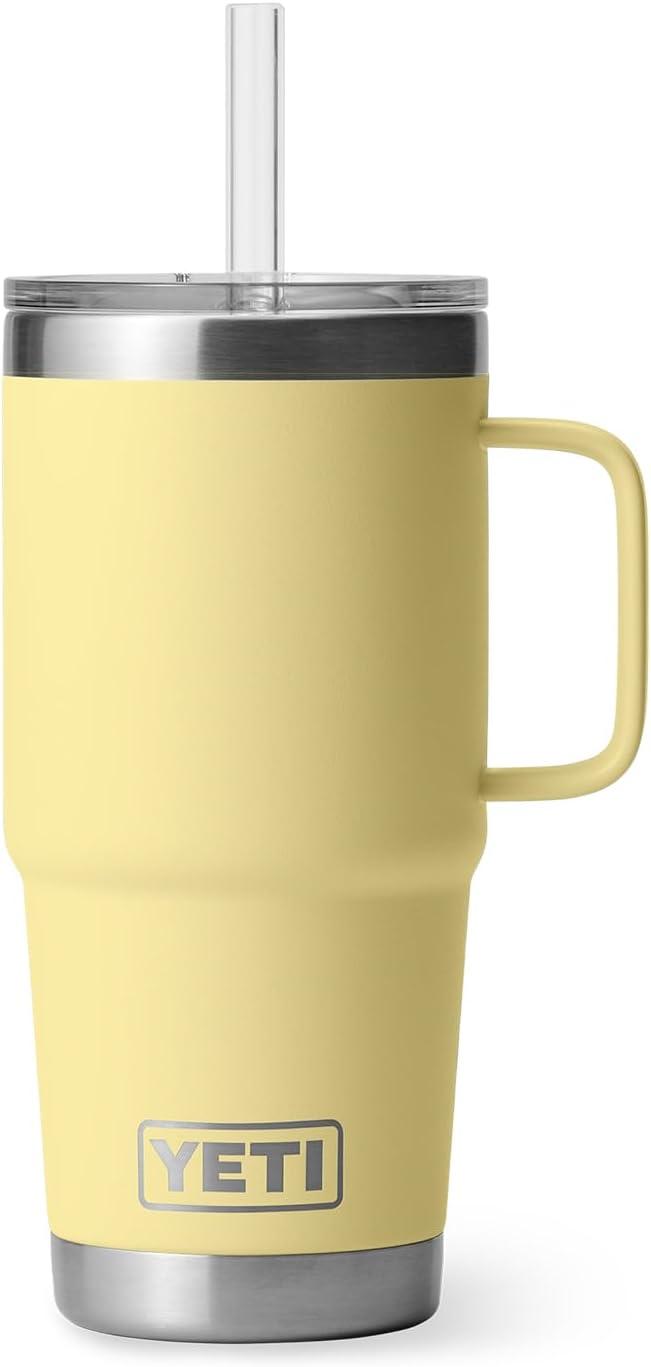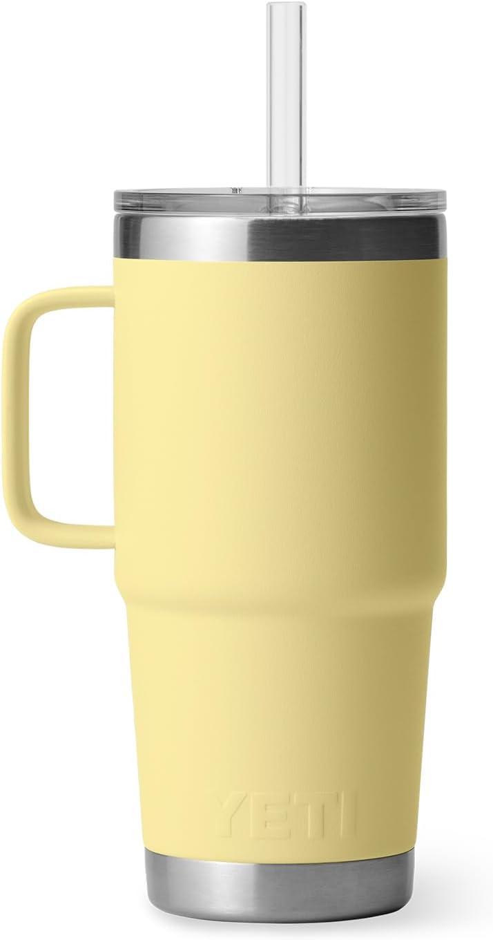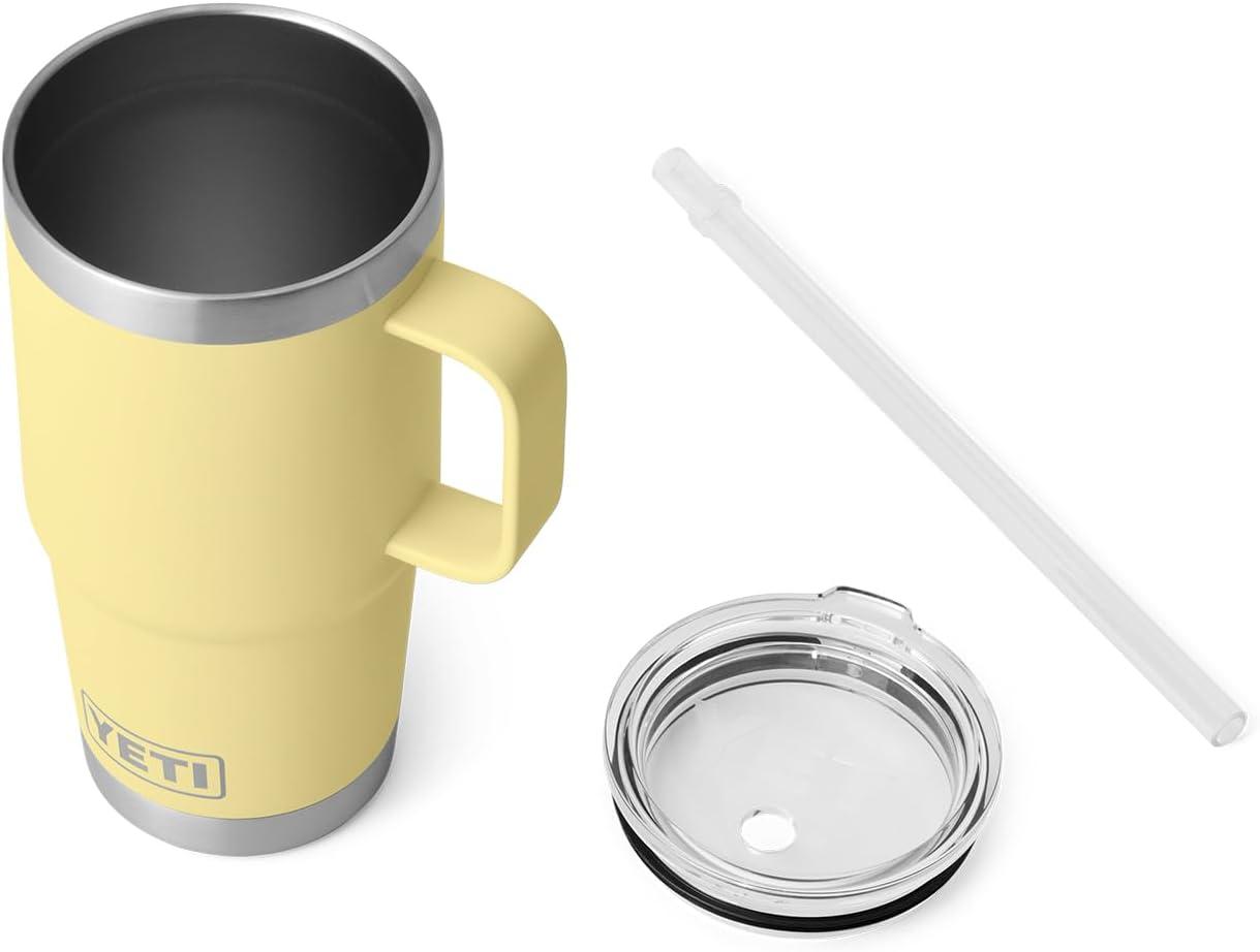 YETI Rambler 25 oz Tumbler with Handle and Straw Lid, Travel Mug Water Tumbler, Vacuum Insulated Cup with Handle, Stainless Steel, Rescue Red(Daybreak Yellow)